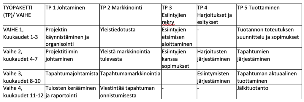 Alla olevan taulukon esimerkissä työpaketit on sijoitettu neljään vaiheeseen ja tuotettu esimerkinomaista sisältöä kuhunkin pakettiin ja vaiheeseen.